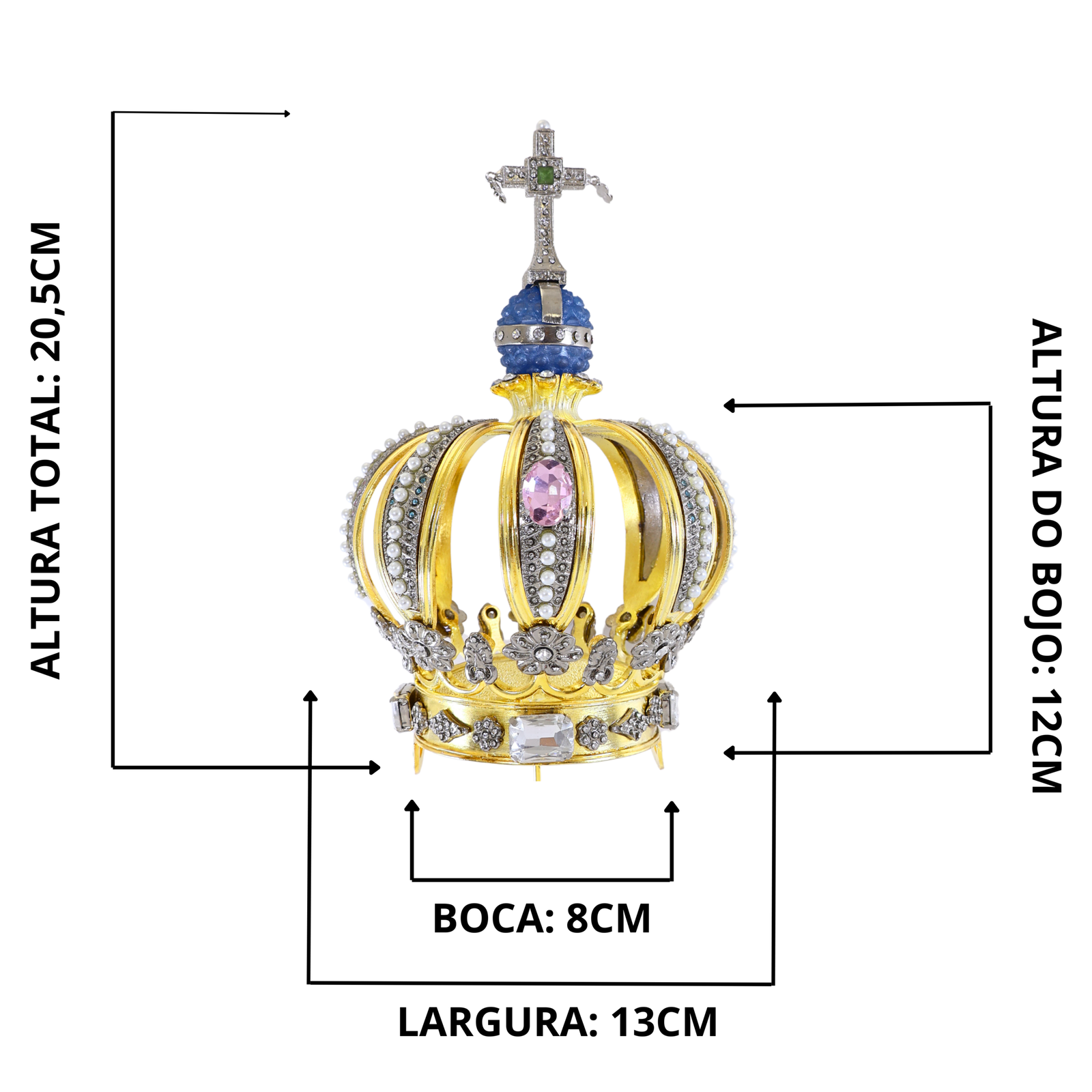 ATENÇÂO: Essa coroa encaixa na cabeça da imagem, por isso ATENÇAO com as medidas da coroa pra não comprar errado, pois a coroa tradicional se sobrepõe a imagem e essa não, ela tem a haste de fixação mas a boca deve caber na cabeça da santa.